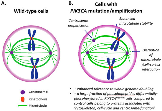Schematic depicting the mitotic spindle in wild-type cells (A) and how this is deregulated in cells with PIK3CA mutation/amplification (B).