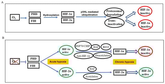 Oxygen-dependent regulation of hypoxia inducible factors HIF-1α and HIF-2α. (A) In presence of oxygen, HIF-1α and HIF-2α are hydroxylated by prolyl hydroxylase domains (PHDs) and FIH (Factor Inhibiting HIF-1), and then targeted for proteasomal degradation mediated by VHL protein. (B) Under acute hypoxia, both HIF-1α and HIF-2α are stabilized. Under chronic hypoxia, HIF-2α is stabilized while HIF-1α is downregulated.