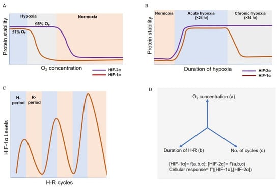 Dynamics of HIF-1α/HIF-2α stabilization under different O2 levels and acute, chronic and cyclic hypoxia. (A) Stabilization of HIF-2α over a wider range of oxygen concentration than HIF-1α. (B) Stabilization of HIF-1α under acute hypoxia and HIF-2α under chronic hypoxia. (C) Effect of H–R periods on HIF-1α levels under cyclic hypoxia. (D) Variables involved in HIF-1α stabilization during cyclic hypoxia.