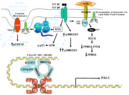 A model illustrating the maintenance of induced SMAD3 phosphorylation and PAI-1 transcription in response to TGF-β1 via Src/p53/FAK/Caveolin-1 signaling. Binding of TGF-β1 to the TGF-β receptor (TGF-βR) stimulates the generation of reactive oxygen species (ROS) and activates Src kinases. Src phosphorylates caveolin-1 at Y14 and transactivates the EGFR at the Src target Y845 residue, leading to mobilization of the MEK-ERK and p38 (not shown) pathways. TGF-β1-initiated Src kinase phosphorylation of caveolin-1Y14 also stimulates FAK activation, Rho-GTP loading, and Rho-ROCK activation at sites of integrin/matrix engagement. pCaveolin-1Y14-Rho-ROCK signaling inhibits PTEN-PPM1A interactions, resulting in a reduction of the SMAD phosphatase PPM1A, maintaining pSMAD2/3 levels required for PAI-1 induction and persistent expression in response to TGF-β1. ROS-mediated ATM activation stimulates p53 phosphorylation and recruitment of p-p53 to the promoter region of genes with p53 binding motifs [31,51,53,59]. The PE2 region E box in the PAI-1 promoter is a docking site for the helix-loop-helix transcription-leucine zipper factors USF1/2 which are activated by MAP kinases as well as other TGF-β1-induced kinases. Members of the USF family reorient the DNA minor grove, promoting interactions between SMAD2/3 tethered to the PE2 region SMAD-binding elements (SBEs) with tetramerized p53, bound to its downstream half-site motifs [51,59]. Occupancy of the immediate 5” upstream SMAD-binding elements (SBEs) with SMAD2/3/4 and co-localization with p53, USF2, and the histone acetyltransferases CBP/p300 facilitates the formation of a multi-component transcriptional complex required for TGF-β1-induced PAI-1 expression.