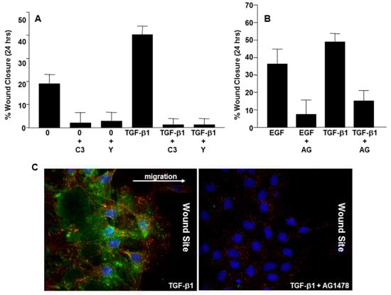 Signaling requirements for VSMC monolayer scratch would closure. Confluent VSMC cultures were scrape-wounded with a pipette tip prior to addition TGF-β1 or EGF with (+) or without a 30 min pre-incubation with the Rho GTPase inhibitor C3 transferase (C3), the ROCK inhibitor Y-27632, or the EGFR kinase inhibitor AG1478. C3 transferase and Y-27632 effectively attenuated both basal and TGF-β1-stimulated VSMC migration (A) and AG1478 significantly reduced EGF as well as TGF-β1 induced migration (B) in response to monolayer wounding. In TGF-β1-treated cultures, PAI-1 expression was evident at the wound edge within hours post-injury (C, left panel). PAI-1 induction was completely inhibited by exposure to AG1478 (C, right panel) correlating with a significant reduction in cell migration (B).