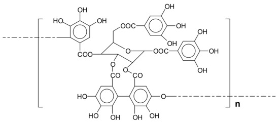 Different from gallo-tannins, ellagi-tannins contain additional binding motifs that arise from additional oxidative coupling reactions between the galloyl fragments [6]. The biosynthesis of ellagi-tannin is therefore an oxidative enzymatic progression of gallo-tannins. The first step is an oxidation of 1,2,3,4,6-pentagalloylglucose to form the monomeric ellagi-tannin. The second step consists essentially of dimerization after a second enzyme-mediated specific oxidation of hexahydroxydiphenoyl group of the ellagi-tannin with the galloyl group of another tannin to form a valoneyl group-containing dimer and these reactions continue to form higher oligomers. An example of ellagi-tannin is the tannin of chestnut wood (Figure 2).