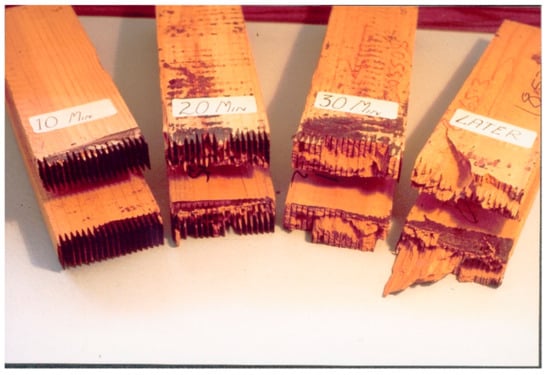 As extensive studies already exist, and this application of tannin is now the second most important after leather manufacturing, only a few of the main achievements of tannin-based adhesives for wood products will be highlighted. (1) The development, optimization, and industrialization of non-fortified but chemically modified thermosetting tannins for particleboard, other particle products, and plywood [11,12,13]. (2) The technology for rapidly pressing tannin adhesives for particle board, which is also industrial [14,15]. (3) The development and industrialization of tannin–urea–formaldehyde adhesives for plywood and in particular as impregnators for corrugated board starch binders [16]. (4) The development and industrialization of cold-setting tannin–resorcinol–formaldehyde adhesives for glulam and fingerjointing [17]. (5) The large-scale development and industrialization of fast-setting “honeymoon” separate application cold-setting adhesives for tannin-bonded glulam and fingerjoints [18,19,20] (Figure 4).