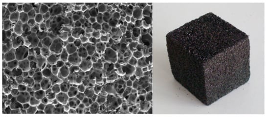 Scanning electron microscope image of the structure of a first-generation tannin–furanic foam (left) and macro-appearance of the same (right).