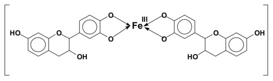 The reason for the coupling of tannins with metals is, for example, the formation of Fe complexes, used to prepare intensely black/violet inks by formation of ferric tannates, and also as anticorrosion varnishes. These coordination complexes are due, for example, to the orthodiphenol hydroxyl groups on the B rings of a flavonoid tannin [107] (Figure 8).