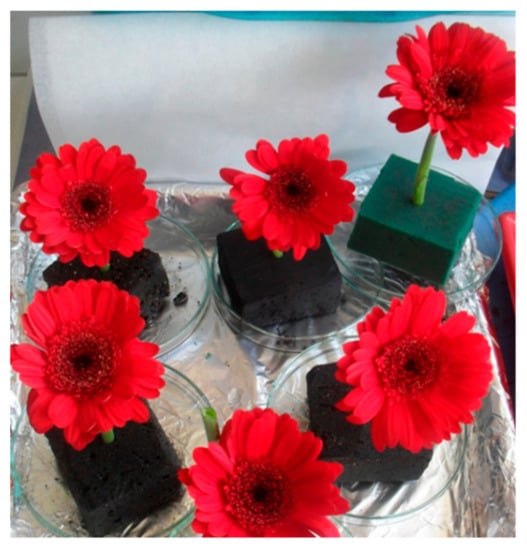 Appearance of cut flowers (Transvaal daisies, Gerbera spp) on a tannin–furanic foam (black) compared to a synthetic phenol–formaldehyde/furanic foam (green).