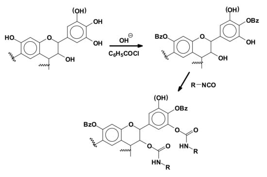 - Thebault, M.; Pizzi, A.; Essawy, H.; Baroum, A.; van Assche, G. Isocyanate free condensed tannin-based polyurethanes. Eur. Polym. J. 2015, 67, 513–523. [Google Scholar] [CrossRef]