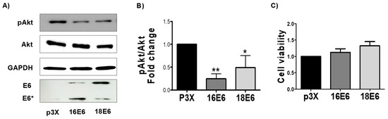16E6 and 18E6 oncoproteins decrease pAkt without changing cell viability in FaDu cells. FaDu cells were transfected with p3X, HPV16 E6- or HPV18 E6-expressing plasmids and were seeded in a 96 well plate. (A) Representative immunoblot; and (B) quantitative densitometry showing Flag-tagged E6 and E6* (E6 spliced product), protein kinase B (Akt) phosphorylated in serine 473 (pAkt) and total Akt. Glyceraldehyde 3-phosphate dehydrogenase (GAPDH) was used as a loading control. Human papillomavirus (HPV) E6 oncoproteins reduce pAkt. (C) Cell viability was quantified after 48 h by 3-(4,5-dimethylthiazol-2-yl)-5-(3-carboxymethoxyphenyl)-2-(4-sulfophenyl)-2H-tetrazolium (MTS) reduction and expressed as fold change in relation to the control. Data are expressed as the mean ± SD. Tukey’s test * p < 0.05 and ** p < 0.005 vs. p3X control, n = 3.