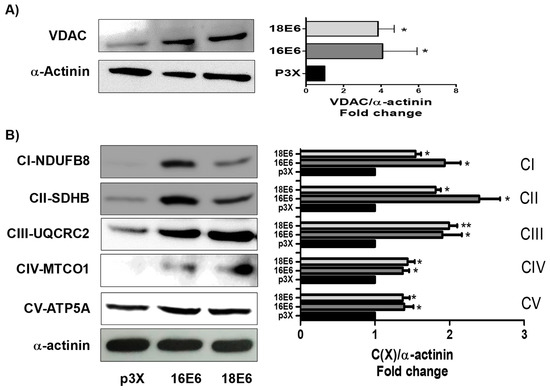 16E6 and 18E6 oncoproteins increase mitochondrial metabolism in FaDu cells. Human papillomavirus (HPV) E6 oncoproteins increase the protein levels of the subunits of mitochondrial complexes I to IV: Complex I subunit CI-NDUFB8, Complex II subunit CII-SDHB, Complex III-Core protein 2 (CIII-UQCRC2), Complex IV subunit I (CIV-MTCO1), and ATP synthase alpha subunit (CIV-ATP5A), as well as the voltage dependence anion channel (VDAC). (A) Representative immunoblot and densitometric analysis of VDAC; and (B) Representative immunoblot and densitometric analysis of mitochondrial complexes subunits I-IV and ATP synthase subunit in FaDu transfected cells. α-actinin was used as a loading control. Data are expressed as the mean ± SD. Tukey’s test * p < 0.05 and ** p < 0.005 vs. p3X control, n = 3.
