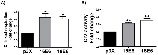 16E6 and 18E6 oncoproteins promote the increase in mitochondrial electron transport system (ETS) activity in FaDu cells. (A) Complex I (CI) linked respiration; (B) Complex IV (CIV) activity. Data are expressed as the mean ± SD. Tukey’s test * p < 0.05 and ** p < 0.005 vs. p3X control, n = 3.