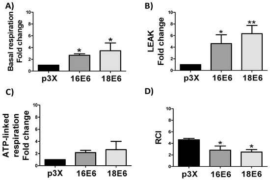 The respiratory parameters were evaluated in whole cells, including ATP-linked respiration, basal and leak respirations, and the respiratory control index (RCI) to determine whether the increase in mitochondrial proteins by E6 is related to mitochondrial bioenergetic. Cell respiration is regulated according to physiological activity, at intracellular adenosine diphosphate (ADP) levels, which is named “basal respiration”. When incubated in the corresponding culture medium, cells maintain a basal level of oxygen consumption activity [45,46]. We found in 16E6 and 18E6 expressing cells an increase of 2.7 and 3.4-fold in basal respiration and 4.6 and 6.3-fold in leak respiration, respectively (Figure 4A,B), which is congruent with the increase in ETS activity and protein levels (Figure 2 and Figure 3). However, the observed increase in leak respiration indicates that only non-phosphorylating respiration is increased, which suggests that the increase in the oxygen consumption that was observed in basal respiration is generated to compensate the electron and proton leak, since ATP-linked respiration did not show significant changes (Figure 4C). Furthermore, RCI parameter displayed a lessening of 1.6 and 1.8-fold, respectively, reaffirming the mitochondrial decoupling (Figure 4D), which suggests that oxygen is not efficiently used by the mitochondria, which could trigger the ROS production.