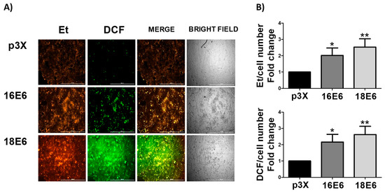 Mitochondrial ROS are released to the cytosol [47,48]. Accordingly, we measured ROS levels in the whole cells. We found an increase in ROS levels of 2- and 2.5-fold, as evaluated by DHE, which is oxidized by O2.− to ethidium (Et), in the presence of 16E6 and 18E6, respectively. We measured another ROS by H2DCFDA, taking a bigger picture of the ROS production induced by E6, since DHE assay mainly measures O2.−. The evaluation by DCF showed an increase of 2.2- and 2.7-fold in cells expressing 16E6 and 18E6, respectively (Figure 6A,B).