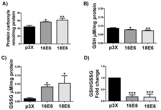 3.7. E6 oncoproteins from HPV16 and HPV18 Induce Oxidative Stress through the Increase in Protein Carbonyls and GSSG and the Decrease in GSH and GSH/GSSG Ratio