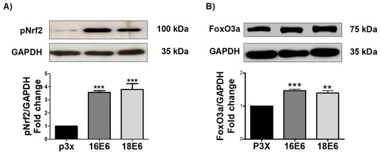 16E6 and 18E6 oncoproteins increase pNrf2 and FoxO3a levels in FaDu cells. Representative immunoblot and quantitative densitometric analysis of (A) nuclear factor (erythroid-derived 2)-like 2 (Nrf2) phosphorylated in serine 40 (pNrf2); and, (B) forkhead box O3 (FoxO3a) in FaDu E6-transfected cells. GAPDH was used as a loading control. Data are expressed as the mean ± SD. Tukey’s test ** p < 0.005, and *** p < 0.0005 vs. p3X control, n = 3.