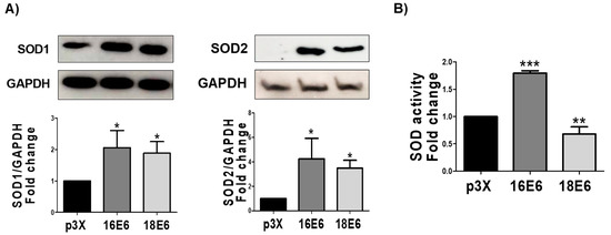 16E6 and 18E6 oncoproteins increase superoxide dismutase 1 and 2 (SOD1/2) levels in FaDu cells. (A) Representative immunoblot and quantitative densitometric analysis of superoxide dismutase 1 and 2 (SOD1 and SOD2); and (B) total SOD activity, which is augmented in FaDu 16E6 expressing cells. Glyceraldehyde 3-phosphate dehydrogenase (GAPDH) was used as a loading control. Data are expressed as the mean ± SD. Tukey’s test * p < 0.05, ** p < 0.005, and *** p < 0.0005 vs. p3X control, n = 3.