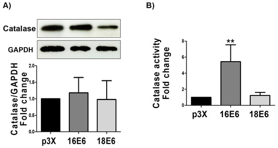 SOD enzymes dismute O2.− molecules to H2O2, allowing for catalase and other peroxidases to degrade H2O2 to water. Therefore, we measured the catalase levels by immunoblot and its activity, by spectrophotometry. We found that even that E6 oncoproteins did not raise catalase expression (Figure 10A), 16E6 increased catalase activity by 5.4-fold (Figure 10B), while 18E6 had no effect. This result correlates with the activation of SOD exclusively by 16E6 oncoprotein.