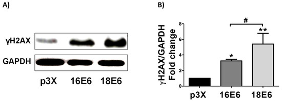 The DNA marker gamma H2AX (γH2AX) was analyzed in the presence of E6 oncoproteins since OS promotes DNA damage. As shown in Figure 11A,B, 16E6 and 18E6 increased DNA damage in 3.2- and 5.4-fold, respectively, in relation to the control. The induction of DNA damage was higher in 18E6 transfected cells. The cells were treated with the antioxidant NAC in order to determine whether the OS induced by E6 oncoproteins is responsible of the observed DNA damage. As shown in Figure S4A,B, NAC alleviated the DNA damage induced by E6 oncoproteins. From these results, we conclude that 16E6 and 18E6 induce DNA damage by OS induction. The highest effect observed in 18E6 expressing cells may be related to its demonstrated lowest antioxidant activity in relation to those harboring 16E6 (Figure 9B and Figure 10B).