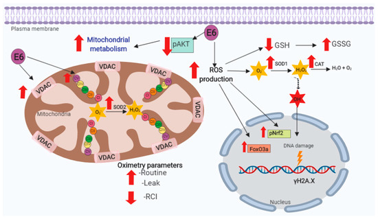 Integrative scheme. E6 oncoproteins from human papillomavirus type 16 (HPV16) and 18 (HPV18) decrease the levels of serine 473 phosphorylated-protein kinase B (pAkt), favoring the mitochondrial oxygen consumption and mitochondrial mass increase. E6 increases basal respiration (Routine), respiration leak and mitochondrial decoupling, while respiratory control index (RCI) significantly decreases, which could be associated to the increase in reactive oxygen species (ROS), oxidative stress (OS), and deoxyribonucleic acid (DNA) damage. Superoxide dismutase (SOD), catalase (CAT), glutathione (GSH), glutathione disulfide (GSSG), voltage-dependent anion channels (VDAC), superoxide anion (O2.−), hydrogen peroxide (H2O2), hydroxyl radical (OH.−), nuclear factor (erythroid-derived 2)-like 2 (Nrf2) phosphorylated in serine 40 (pNrf2), forkhead box O3 (FoxO3a), gamma H2A histone family member X (γH2AX), and mitochondrial complexes I to V (CI, CII, CIII, CIV, CV).The yellow ray indicates damage to DNA.