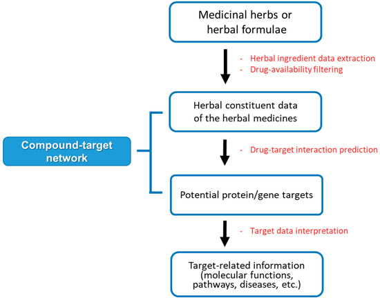 In the last decade, researchers have employed network pharmacology methods to elucidate the potential targets and toxicity of THMs [9]. THM-network pharmacology (THM-NP) studies are conducted by constructing an herb–compound–target (H-C-T) network by integrating the herbal constituent data and drug-target interactions (DTIs) information. Then, the target network is analyzed to interpret related biological functions, pathways, and diseases (Figure 1). Since there are no gold standard methods for THM-NP studies yet, researchers have developed and applied various tools and databases for each step.