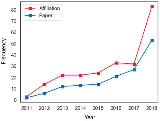 We identified the number of published THM-NP studies over time, along with the affiliations involved in the studies. THM-NP studies that met our criteria for inclusion have appeared since 2011. In 2011, only three affiliations published two THM-NP studies, but in 2018, the number of affiliations and studies increased to 83 and 52, respectively (Figure 3). The increased number of papers and of affiliations involved indicates that the THM-NP research fields have continuously grown.