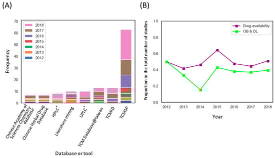 Methodological trends in the construction of the herb–compound network. (A) Frequency of databases and tools used to identify constituents of herbal medicine. * Analytical techniques to identify the ingredients of herbal medicines; Ultra Performance Liquid Chromatography (UPLC), High-performance liquid chromatography (HPLC) (B) The application rate of the drug availability method by year. Note that Obioavail (OB) and drug-likeness (DL) are among the most commonly used drug availability assessment methods in THM-NP studies. THM-NP studies in 2011 were excluded from the visualization due to the low frequency (n = 2). TCMSP, Traditional Chinese Medicine Systems Pharmacology Database; TCMID, Traditional Chinese Medicine Integrated Database.