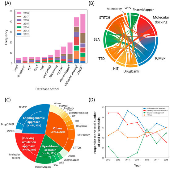 Methodological trends in the construction of the compound–target network. (A) The frequencies of databases and tools used to identify targets of herbal ingredients. * databases that provide validated drug-target interactions (DTIs); ** databases that provide validated databases that provide both validated and predicted DTIs; # Computational tools to predict DTIs. (B) A co-occurrence pattern of the DTI method. (C) Categories of DTI methods and their composition. The outer circle and inner circle represent the DTI methods and their categories, respectively. (D) The annual rate of the groups of DTI methods. Note that THM-NP studies in 2011 were excluded from the visualization due to their low frequency (n = 2). TCMSP, Traditional Chinese Medicine Systems Pharmacology Database; TTD, Therapeutic Target Database; SEA, Similarity Ensemble Approach; HIT, Herb Ingredients’ Targets; WES, Weighted Ensemble Similarity.