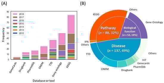 Trends in the biomedical databases used for target interpretation. (A) The frequencies of databases used for target interpretation. (B) Categories of databases and their composition. The outer circle and inner circle represent the databases used for target interpretation and their categories, respectively. Note that THM-NP studies in 2011 were excluded from the visualization due to their low frequency (n = 2). KEGG, Kyoto Encyclopedia of Genes and Genomes; TTD, Therapeutic Target Database; OMIM, Online Mendelian Inheritance in Man; IPA, Ingenuity Pathway Analysis.