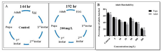- Panacek, A.; Prucek, R.; Safarova, D.; Dittrich, M.; Richtrova, J.; Benickova, K.; Zboril, R.; Kvitek, L. Acute and chronic toxicity effects of silver nanoparticles (NPs) on Drosophila melanogaster. Environ. Sci. Technol. 2011, 45, 4974–4979. [Google Scholar] [CrossRef] [PubMed]