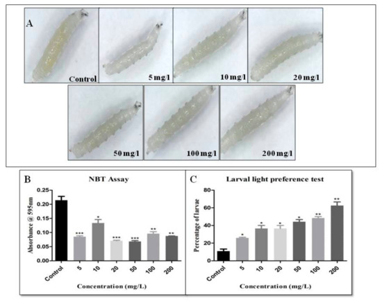 - Posgai, R.; Cipolla-McCulloch, C.B.; Murphy, K.R.; Hussain, S.M.; Rowe, J.J.; Nielsen, M.G. Differential toxicity of silver and titanium dioxide nanoparticles on Drosophila melanogaster development, reproductive effort, and viability: Size, coatings and antioxidants matter. Chemosphere 2011, 85, 34–42. [Google Scholar] [CrossRef]