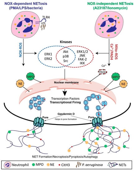 A unified model of neutrophil extracellular trap (NET) formation. Different agonists induce either Nox-dependent (agonists: Phorbol 12-myristate 13-acetate (PMA), LPS, bacteria etc.) or Nox-independent NET formation (agonists: A23128, ionomycin, uric acid crystals etc.). These agonists induce different forms of reactive oxygen species (ROS) (Nox-ROS and Mitochondrial-ROS). Both of these ROS activate different sets of kinases specific to Nox-dependent or Nox-independent NET formation. These kinases then activate transcription factors leading to transcriptional firing at promotor regions. This process enables chromatin decondensation and is further facilitated by PAD4-mediated citrullination in Nox-independent NET formation. Enzymes such as neutrophil elastase and myeloperoxidase enter the nucleus and decorate the chromatin. Finally, in certain forms of NET formation, the nucleus disintegrates, and NETs are released, whereas in others the protein gasdermin-D helps to form pores to enable the release of NETs.