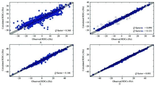 - Valafar, H.; Prestegard, J.H. REDCAT: A residual dipolar coupling analysis tool. J. Magn. Reson. 2004, 167, 228–241. [Google Scholar] [CrossRef]
