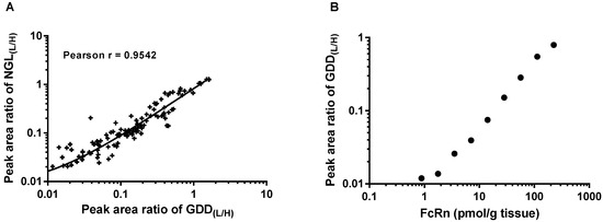 For human tissue-specific FcRn quantification, multiple FcRn surrogate peptides were directly adapted from the established methodology previously reported for the quantification of human FcRn in Tg32 transgenic mice [11]. The peptide sequence GDDTGVLLPTPGEAQDADLK (GDD) was selected as the quantification peptide and is located in the cytosolic domain of human FcRn. The peptide QGTWGGDWPEALAISQR previously used for the human FcRn measurement in Tg32 mouse tissue was not suitable for quantitative analysis in human tissues, as matrix background signals interfered with sensitive analysis. Subsequently, the peptide NGLAAGTGQGDFGPNSDGSFHASSSLTVK (NGL), which is located in the extracellular domain of human FcRn, was selected as the confirmatory peptide for FcRn quantification in human tissues. The peak area ratios from light and corresponding heavy stable isotope-labelled peptide standards (L/H) were determined for GDD and NGL peptides from all human tissue measurements in this study. There was generally good agreement with a high Pearson r score of 0.95, as shown in Figure 1A, providing confidence that the human FcRn quantification was robust and confirming the integrity of the receptor by concurrent monitoring of peptides from both the extracellular and cytosolic domain. Calibration standards were recombinant full-length human FcRn protein spiked into control mouse liver tissue lysates, and GDD peptide was selected as a quantification peptide due to better sensitivity. The quantification range was 0.89−226.35 pmol/g tissue (Figure 1B). The selected analyte peptides are proteotypic to human FcRn and are not conserved in mouse FcRn or elsewhere in the mouse proteome.