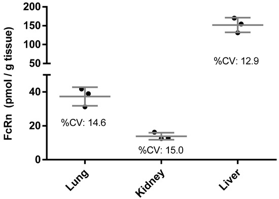 Reproducibility of FcRn measurement in normal human liver, lung and kidney tissues from independently prepared lysates from dissected tissue portions of the same tissue sample.