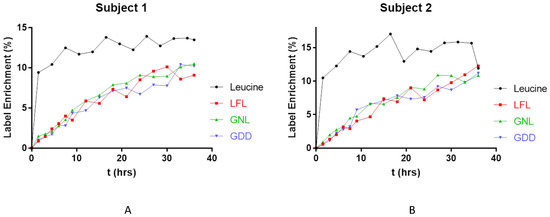 Levels of labeled leucine enrichment in plasma of Subject 1 (A) and Subject 2 (B) were shown by the black line. Tracer leucine incorporation into FcRn was monitored by three FcRn peptides, LFL (red line), GNL (green line), and GDD (blue line).