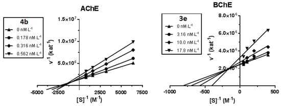 Kinetic study was performed in order to describe the interactions of the compounds 4b and 3e with hAChE and hBChE, respectively. Inhibition kinetics were elucidated from velocity curves that were measured at several concentrations of the corresponding substrate (AChE—acetylthiocholine, BChE—butyrylthiocholine) and tested compounds. The type of enzyme inhibition and corresponding kinetic parameters (Ki and Ki’) were determined by nonlinear regression analysis. Results for each type model of inhibition (competitive, non-competitive, uncompetitive and mixed) were compared by sum-of-squares F-test. Statistical analysis showed mixed type of inhibition (p ˂ 0.05), which is in line with the Lineweaver–Burk plot, used for visualization of obtained data (Figure 2).