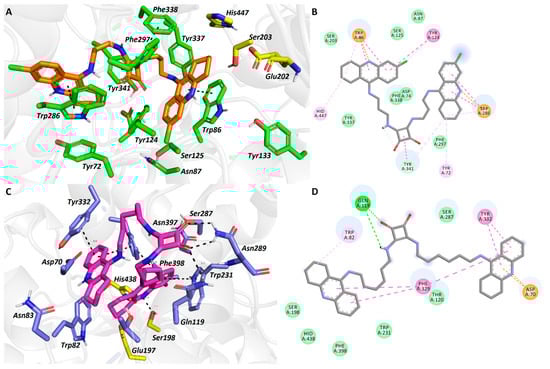 Docking results for the tacrine-squaramide hybrids 4b and 3e within hAChE (A,B) and hBChE (C,D) active sites, respectively (PDB IDs: 4EY7, 4BDS). A and C—Superimposed analogues 4b and 3e (orange and purple carbon atoms, respectively) as 3D figures; B and D—2D figures 4b and 3e, respectively. Generally to A and C—important amino acid residues involved in the ligand-enzyme interactions are displayed as green and blue carbon atoms, respectively; catalytic triad residues are shown in yellow, the rest of the enzyme is represented as a light-grey cartoon. Figures A and C were generated with PyMol 1.5.0.4 (The PyMOL Molecular Graphics System, Version 1.5.0.4 Schrödinger, LLC, Mannheim, Germany), Figures B and D were created with Discovery Studio 2016 Client software.