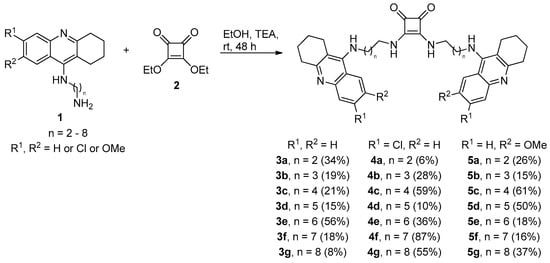 Symmetrical squaramides are generally prepared by the reaction of dialkyloxysquarate derivatives with an excess of primary or secondary amines []. Aliphatic amine condensation of corresponding tacrine derivatives 1 with diethoxysquarate (2) in ethanol in the presence of TEA afforded desired products with 6–87% yields (THA family—3a–3g; 6-Cl-THA family—4a–4g and 7-MEOTA family—5a–5g; Scheme 1). Intermediates of general structure 1 varying in the length of alkyl chains were prepared according to previously published methods [,]. During the synthesis, we also observed the formation of monomeric analogues of squaramides (not shown in the Scheme 1), but these were chemically unstable when isolated and thus were excluded from further biological studies. All final compounds were characterized by 1H, 13C-NMR spectra and HRMS analysis. LC analysis confirmed their purity >95%.