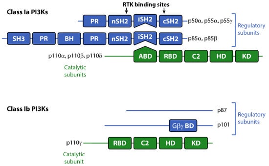 Schematic representation of Class I PI3K catalytic and regulatory subunits. Abbreviations: ABD, adaptor binding domain; BH, breakpoint cluster region homology domain (Rho-Gap-like domain); C2, C2 domain; Gβγ BD, Gβγ binding domain; HD, helical domain; KD, kinase domain; iSH2: inter-SH2 domain (p110 binding domain); PR, proline-rich domain; RBD, RAS binding domain.