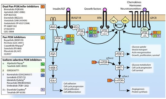 Signaling pathways activated by different isoforms of Class I PI3K and PI3K inhibitors that target specific components of these pathways. Class 1a isoforms of PI3K are attracted to the membrane by the activation of RTKs (including IR/IGF1R), while PI3Kγ (and to a lesser extent PI3Kβ) is recruited by GPCR activation. The membrane proximity of PI3K results in the phosphorylation of membrane-bound PIP2 to PIP3, which mediates the activation of downstream protein kinases involved in a wide range of cellular processes. The various pan PI3K and isoform-specific inhibitors listed are ≥Phase 2 clinical trial according to www.clinicaltrials.gov (accessed August 2019). Abbreviations: AKT, Protein kinase B; Erk, extracellular signal-regulated kinase; GPCR, G-protein coupled receptor; IGF1R, insulin-like growth factor 1 receptor; IRS1, insulin receptor; MEK, MAPK/ERK kinase; mTOR, mammalian target of rapamycin; mTorc1, mammalian target of rapamycin complex 1; mTorc2, mammalian target of rapamycin complex 2; PDK1, 3-phosphoinositide-dependent protein kinase 1; PI3K, phosphoinositide 3-kinase; PIP2, phosphatidylinositol (4,5)-bisphosphate; PIP3, phosphatidylinositol (3,4,5)-triphosphate; PTEN, phosphatase and tensin homologue; RTK, receptor tyrosine kinase.