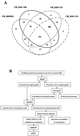 Data analysis from mass spectrometry and selection of candidate proteins. (A) A total of 1138 protein molecules were found in cholangiocarcinomas (CCAs) and immortalized cholangiocyte secretomes. Venn diagram presents the number of proteins in each cell line secretome sample and the degree of protein overlapping. The oval dashed line indicates the total proteins in the conditioned medium (CM) of MMNK1, oval solid line is the total proteins in CM_KKU-100, oval dotted line is total proteins in CM_KKU-213, and the broken line is the total proteins in CM_KKU-214. Ninety proteins were expressed commonly in three CCA secretomes. (B) Flowchart of the selection of secretory proteins from 90 proteins overexpressed in CCA. Proteins having a signal peptide or non-classical proteins that have no transmembrane helix were identified in serum/plasma database, and the maximum number of signal peptide cleavage sites was used for stepwise selection.