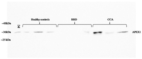 Validation of the selected candidate protein, APEX1 in serum samples by western blot analysis. BBD: benign biliary diseases.