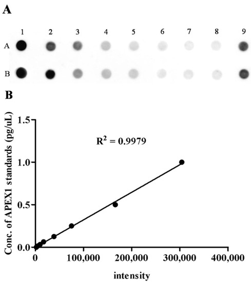 The level of serum APEX1 detected by dot blot assay. (A) The image of the dot blot assay of serum APEX1. Samples A1 to A7 were standards, sample A8 was the blank control, sample A9 was positive control, and row B was the duplicated row of A. (B) The standard curve of APEX1 levels.