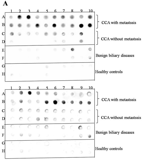 The following are available online at https://www.mdpi.com/2218-273X/9/9/413/s1, Figure S1: Shuffling and randomization of serum samples, Figure S2: Validation of the accuracy of dot blot quantification. Table S1: The relative expression level of 90 distinct proteins found in the secretome of three CCA cell line.