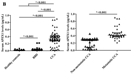 Therefore, the feasibility of APEX1 as a biomarker for CCA was validated further by measuring its level in the sera from CCA, benign biliary diseases (BBD), and healthy controls. Moreover, the functional importance of APEX1 for tumor metastasis was verified using in vitro cell migration and invasion assays of gene-silenced CCA cells. The results presented here showed that APEX1 could be not only a diagnostic marker for CCA but also be a prognostic marker for CCA.
