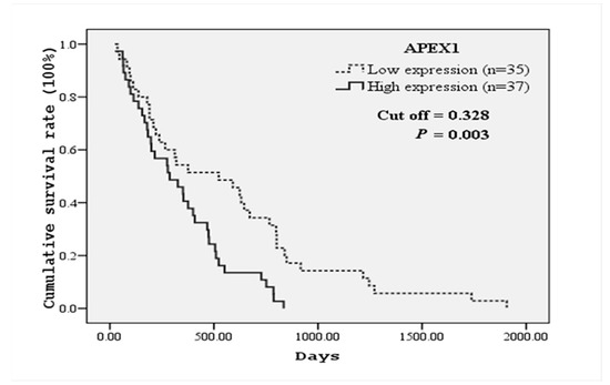 Because serum APEX1 level was significantly higher in CCA patients with lymph node metastasis than in the patients without metastasis, we further analyzed the correlation between serum APEX1 level and the clinicopathological features of CCA patients. For this purpose, we divided CCA patients into high and low serum APEX1 groups using a median APEX1 value of CCA patients as a cut-off. High serum APEX1 level was correlated with lymph node metastasis and shorter mean survival time, but not with other parameters (Table 4). Correlation between serum APEX1 level and the survival time was further confirmed using the Kaplan–Meier graph (Figure 5). High serum APEX1 group had a mean survival time of 337.2 days, whereas low serum APEX1 group had a mean survival time of 569.8 days with p = 0.003 by log-rank test.