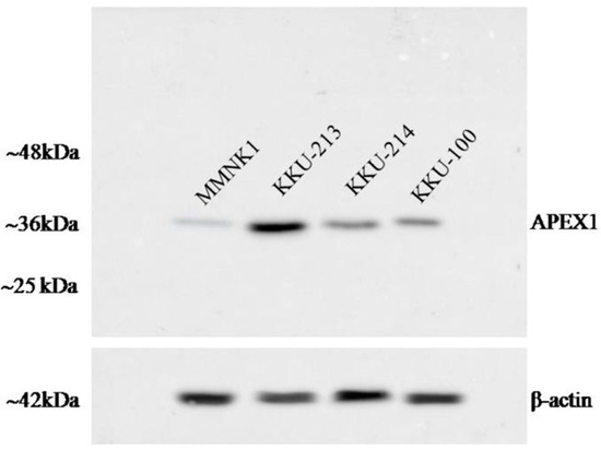 The image of western blot. The expression of APEX1 in three CCA cell lines and control immortalized cholangiocyte MMNK1 cell line.