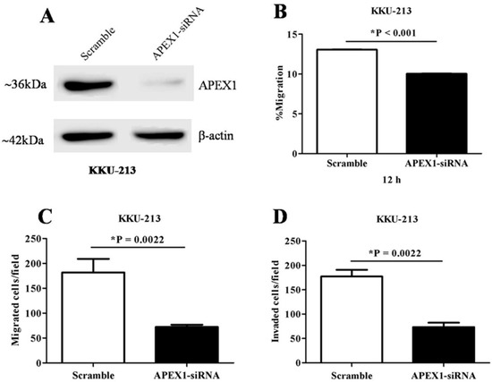 Since APEX1 expression was highest in the cell lysate of KKU-213 cells in comparison with the cell lysate of the other two CCA cell lines, we selected this cell line for APEX1 gene silencing experiments. In brief, KKU-213 cells were cultured in Ham’s F-12 medium supplemented with 10% fetal bovine serum, 100 U/mL of penicillin, and 100 μg/mL of streptomycin and incubated at 37 °C in 5% CO2 air atmosphere. The cells were subcultured every three or four days. For the APEX1 gene silencing using a siRNA technique, the cells (1.5 × 105 cells/well) were seeded in a 6-well plate and cultured overnight before being transfected with 100 pM of siAPEX1 (Cat#orb260731, Biorbyt, Cambridge, UK), while scrambled siRNA (Invitrogen, Carlsbad, CA, USA) was used as a negative control. Transfection was carried out using Lipofectamine 2000 (Invitrogen, Carlsbad, CA, USA) according to the manufacturer’s instructions. After 6 h of transfection, the culture medium was changed to complete medium, and the plates were incubated at 37 °C until 48 h. To check the suppression of protein expression, the cells were harvested in lysis buffer and incubated at 4 °C for 10 min. The cell lysate was centrifuged at 20,000 × g (4 °C) for 30 min. The level of APEX1 protein was determined using western blot analysis with ß-actin as a loading control. APEX1-silenced and control scrambled cells were tested for migration and invasion assay in vitro.