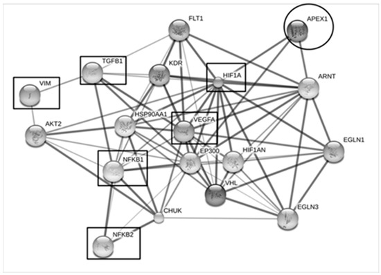 The interaction map of the APEX1 and metastatic processes-associated proteins. Protein-ligand interaction was predicted by STITCH Version 5.0. Protein-protein interactions are represented in solid lines. Stronger associations are represented by thicker lines. Weak associations are represented by thin lines. APEX1 was predicted to have strong interaction with vascular endothelial growth factor (VEGF), hypoxia-inducible factor-1alpha (HIF-1α), nuclear factor kappa B (NF-κB), transforming growth factor β (TGFβ), and vimentin (VIM).