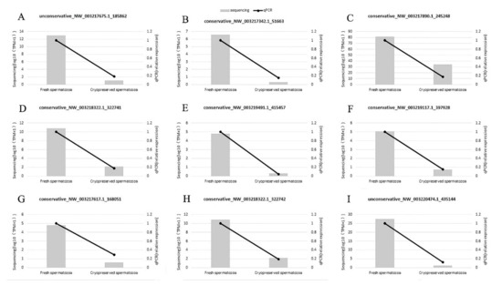 Cryopreservation, as an important part of artificial insemination (AI), is the most efficient method for long-term preservation of valuable genetic material from livestock, especially in endangered wild animals [1,2]. However, the process of freeze-thawing could strongly impair the fertilizing capacity and survival of sperm by reducing sperm motility and membrane integrity, increasing ROS and oxidative stress, changing membrane permeability, decreasing membrane potential, and eventually resulting in apoptosis [3,4,5]. Furthermore, the degradation effect exerted by freeze-thawing on other components crucial for sperm fertilizing ability, such as mRNAs, microRNAs (miRNAs) and long non-coding RNA (lncRNAs), could lead to the structural and functional damages in sperm, also referred to as cryoinjuries [6,7,8]. However, the molecular mechanism of sperm cryoinjury and freeze-tolerance remain largely unknown.