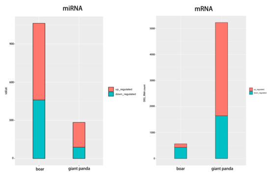 The number of DE mRNAs in giant panda sperm were significantly higher than that of boar sperm. On the contrary, the number of DE miRNAs in giant panda was obviously lower than that in boar sperm (Figure 2). Among the DE mRNA in boar sperm, 441 are target genes of the DE miRNAs, however, 1639 DE target mRNAs of the DE miRNAs were found in giant panda sperm (Table S2).